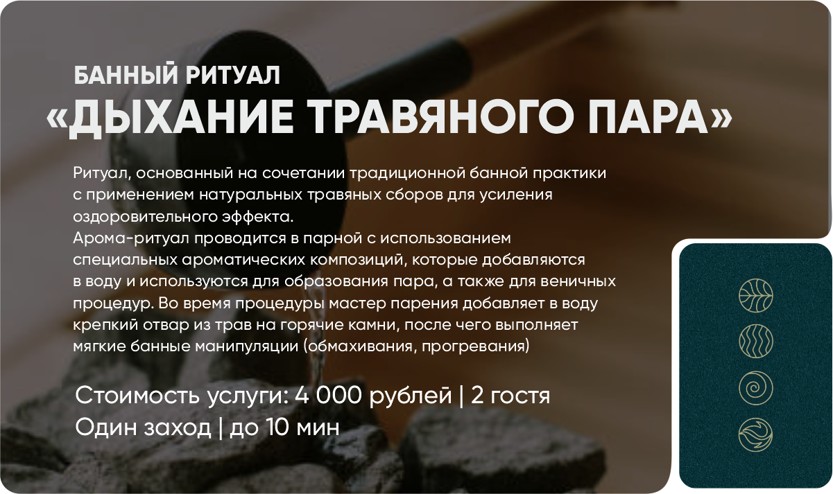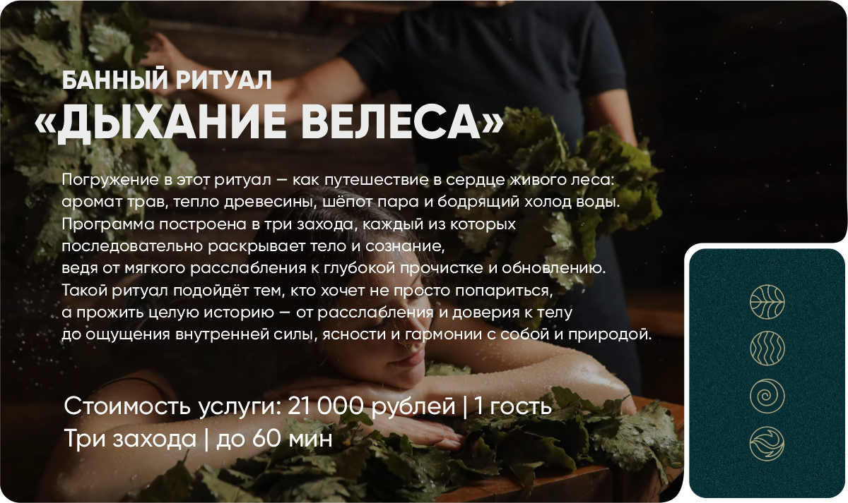 Каждая программа собрана как цельная система: последовательность заходов, выбор веников, работа мастера, контраст, ароматерапия — всё имеет свою функцию и работает на результат.